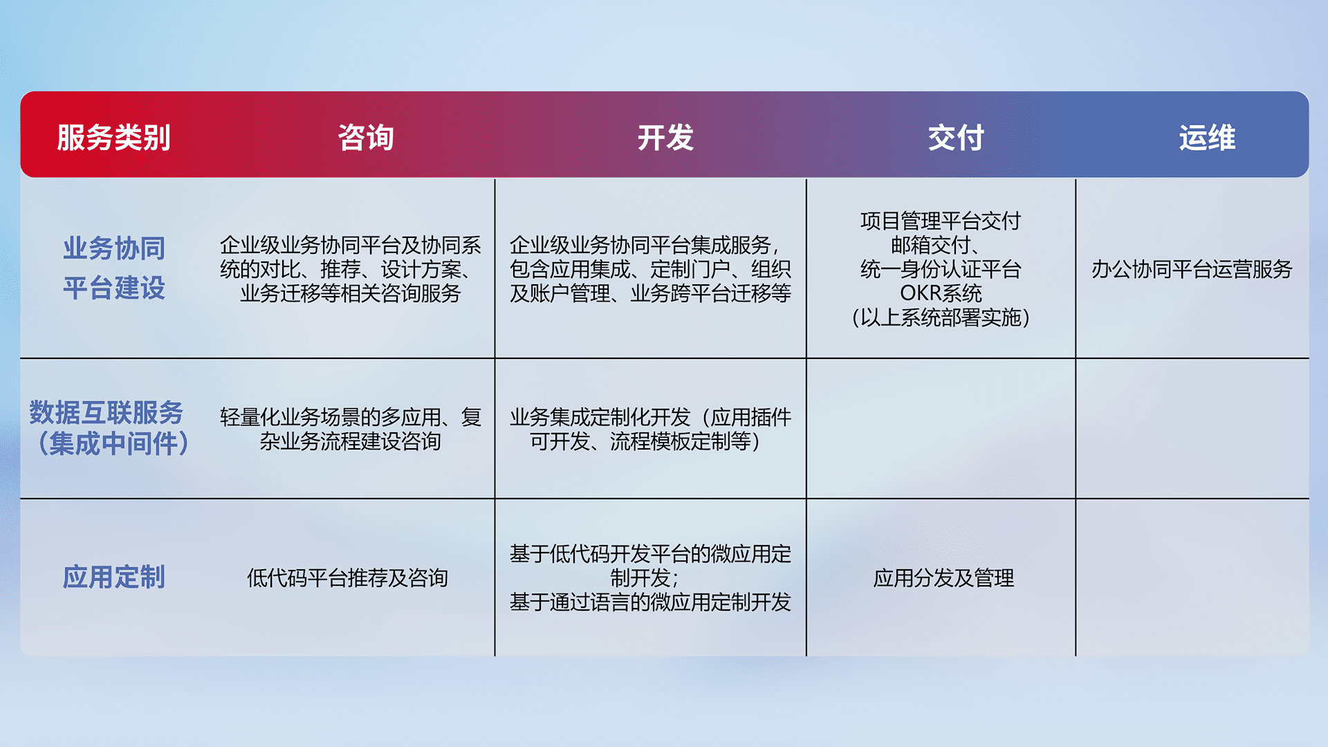 针对钉钉、、、企微、、、IDaas等平台级产品提供产品的规划、、、方案、、、、交付、、、定制化开发等服务,,,,实现如统一协同办公、、、、智能客户服务、、、、混合会议管理、、、、智能数据查询、、、、等业务场景,,实现数字化转型。。。